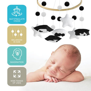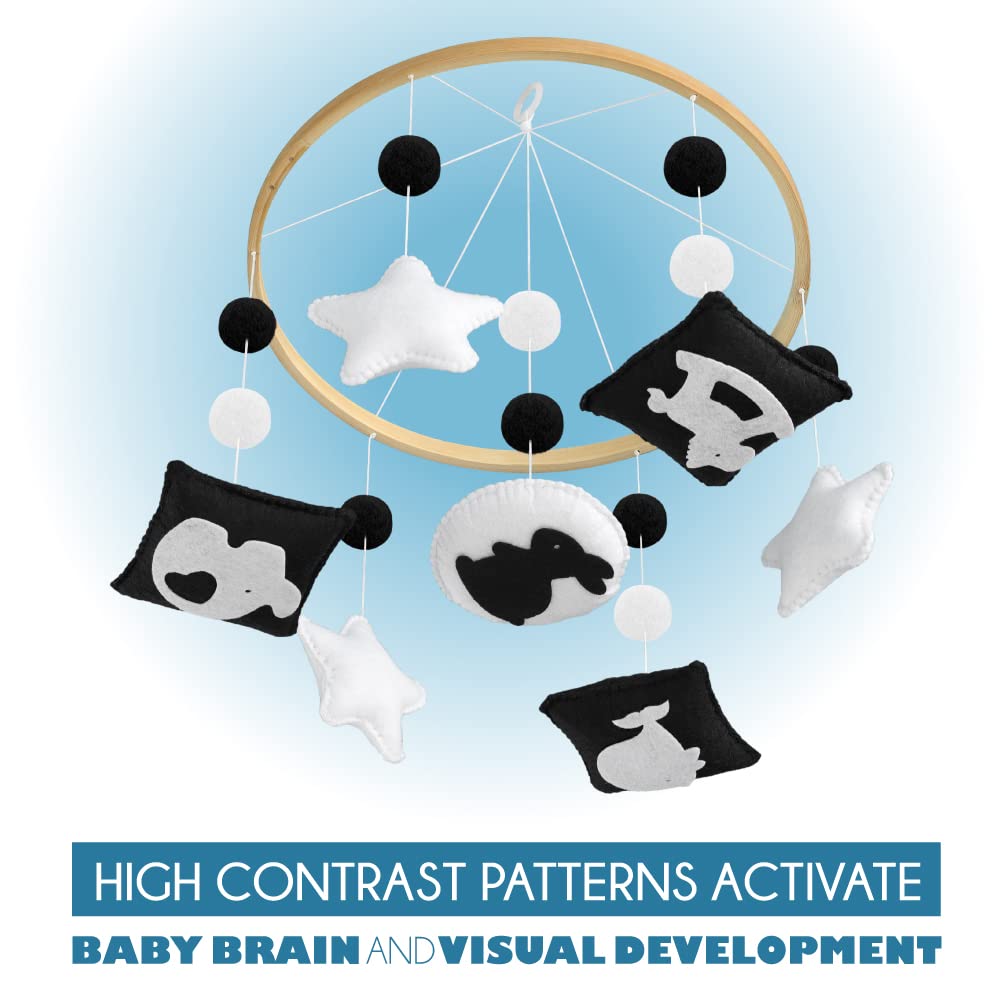 - VISUAL STIMULATION FOR BABY 0-6 MONTHS - Introduces baby to high contrast images and colors for early visual development with a hanging mobile over little one's crib. The baby crib toys that attach to the crib are high contrast baby toys with 5 different shapes which give visual stimulation to engage your baby.