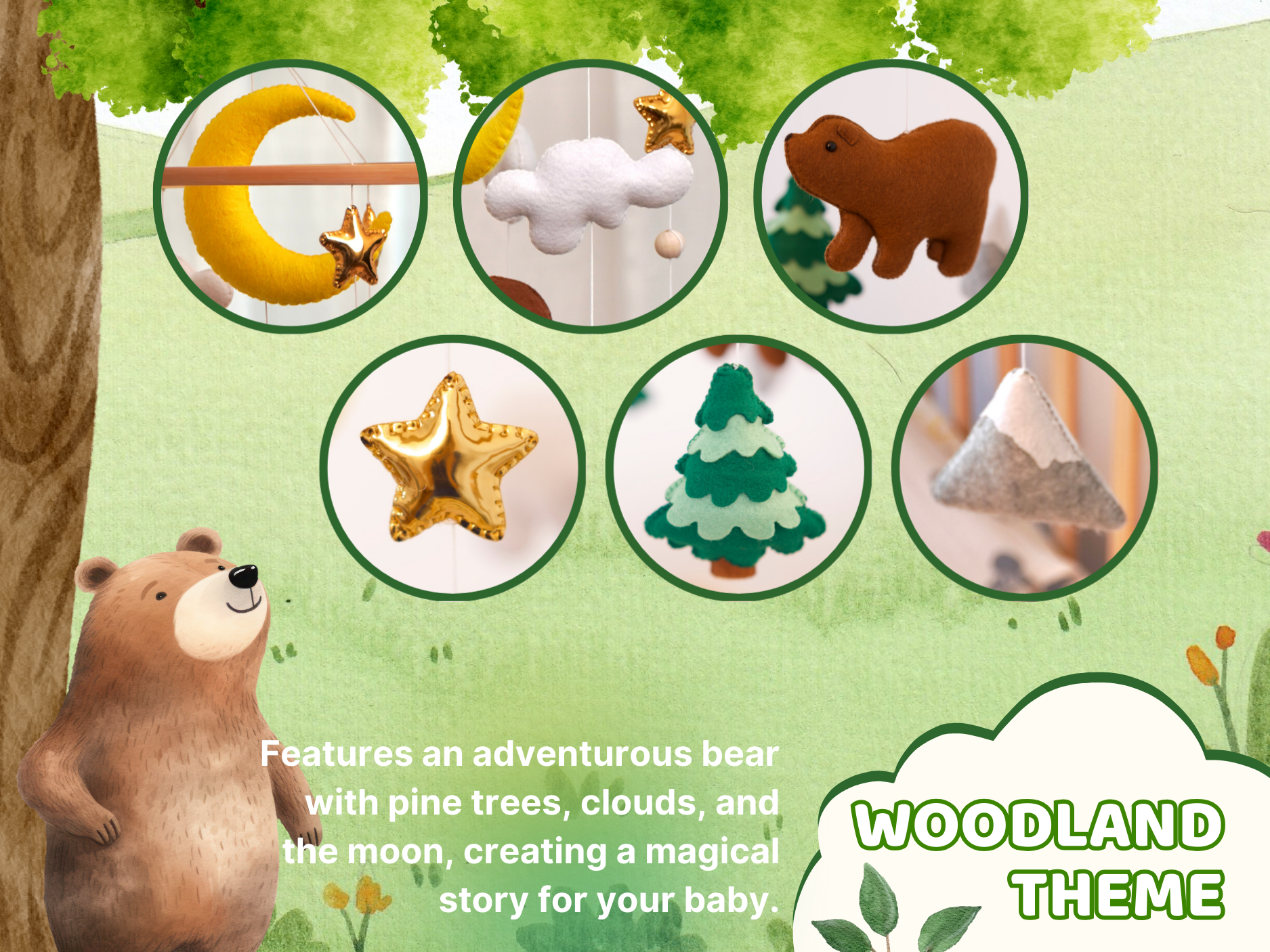 π» WOODLAND THEME β Adorable bear, trees, and stars create a magical nursery scen.