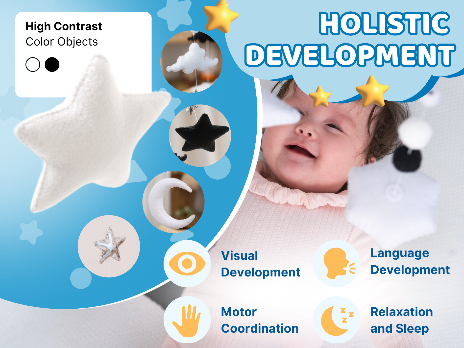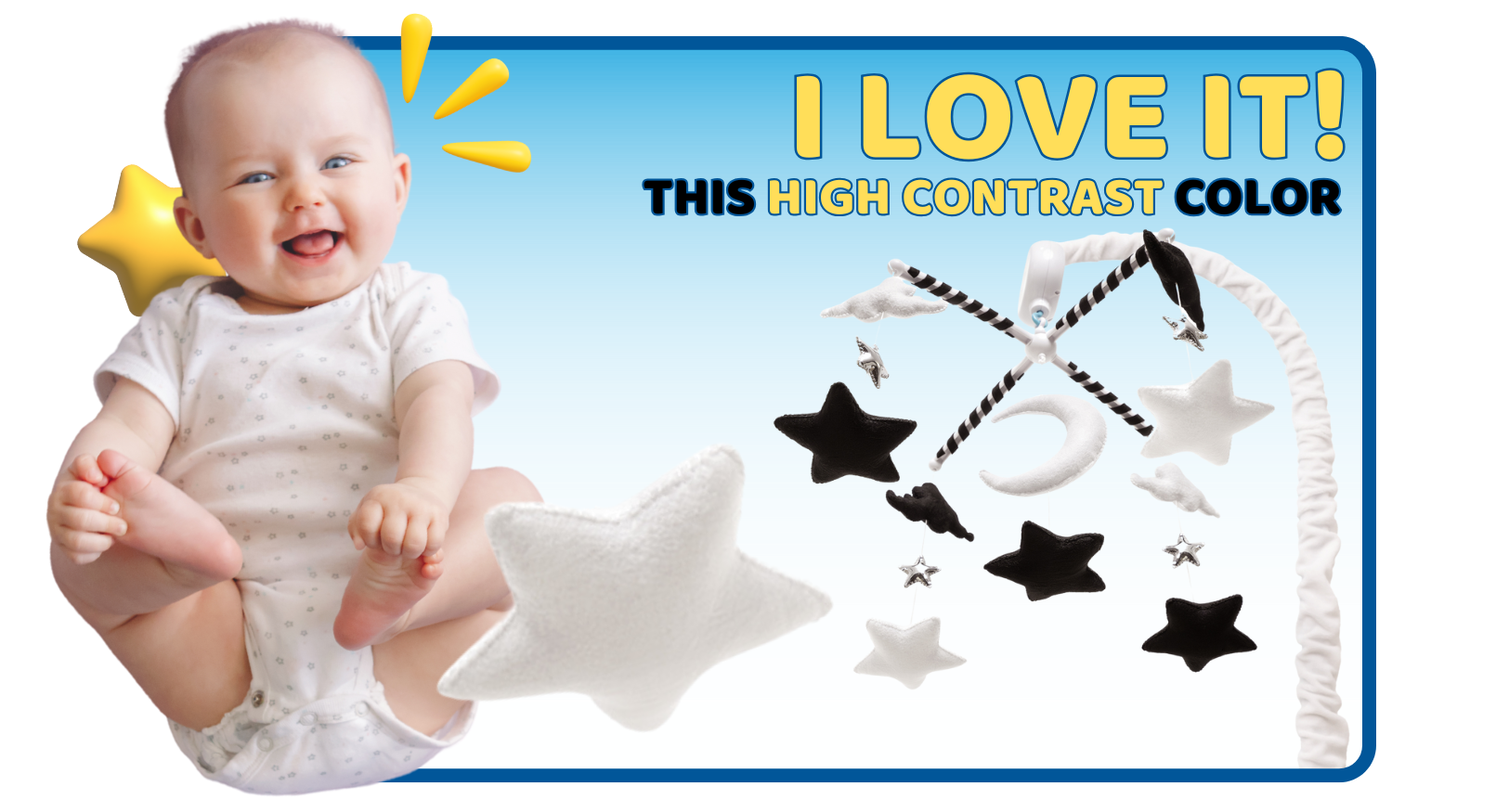 🌱 VISUAL STIMULATION 0–5M – High-contrast black & white moon, clouds, and stars support early visual development.